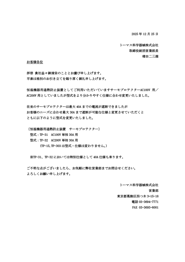 サーモプロテクター、型式および仕様変更のお知らせ